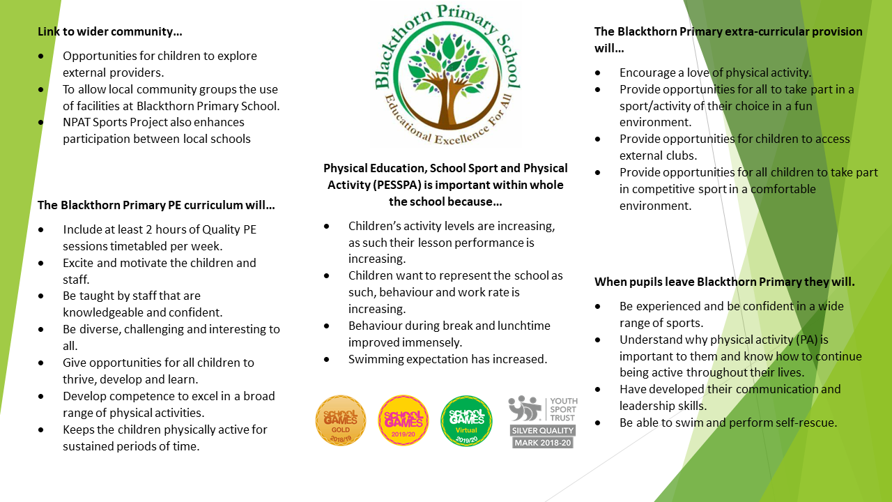 - Engaging with local schools through the enhanced schools package, accessing a range of opportunities for pupils to participate in competitive sport, training for young leaders and training opportunities for subject leaders